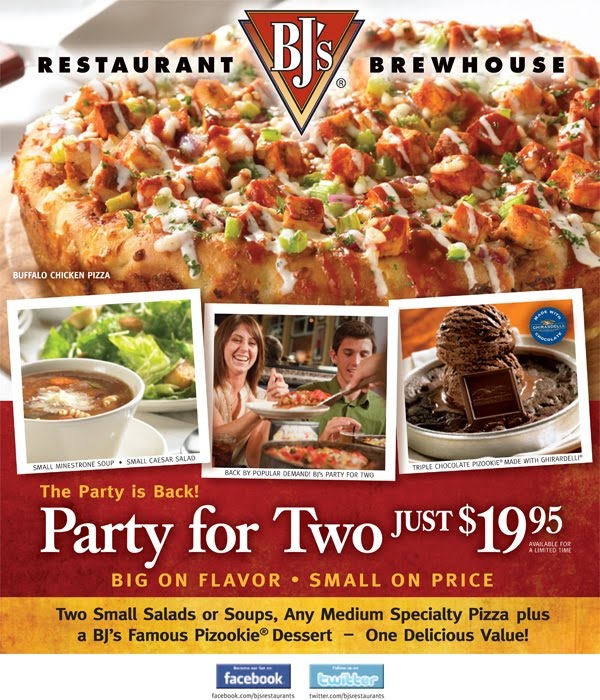 A new promotion offers a Party for Two — two small soups or salads, a medium specialty pizza and a signature Pizooki dessert — for $19.99. (Regularly, you might pay as much as $37.20 for the combo items, depending on the selection.) Participating locations only.