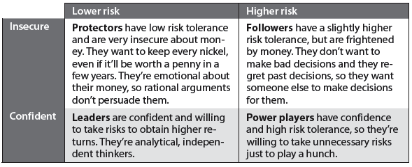 Researchers categorize investor behavior by risk tolerance, psychology, gender, and a gazillion other factors. However, all this research boils down to four investor types, based on the level of risk they’re willing to tolerate and on their confidence level, as the table below shows. If you recognize yourself in any of these descriptions, you can learn how to improve your investing habits. Most people see a little bit of themselves in a couple of the categories. This overlap is normal, so read all the descriptions and develop a plan that works for your personality.